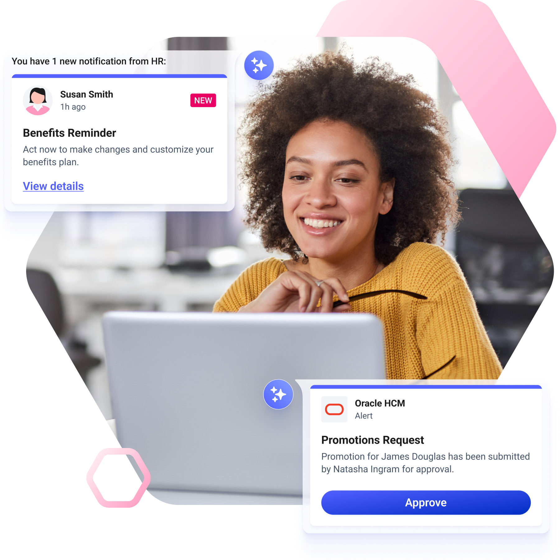 Automate approvals and reminders, delivering them to employees in an intelligent notification stream. Surface notifications directly from HR systems such as Oracle HCM or SAP Fieldglass, making it even easier to view reminders, or to complete approvals, without having to navigate to the source system.